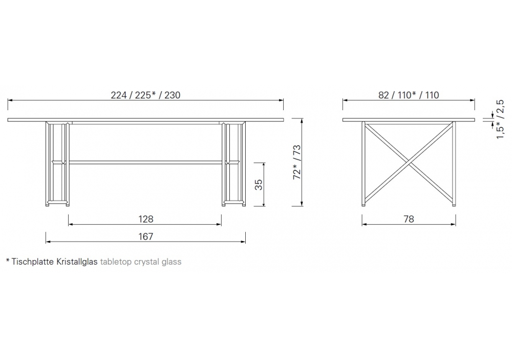 | Dimensiones | 224 x 82 x H 73 cm; 230 x 110 x H 73 cm; 225 x 110 x H 72 cm (Glass top only). |