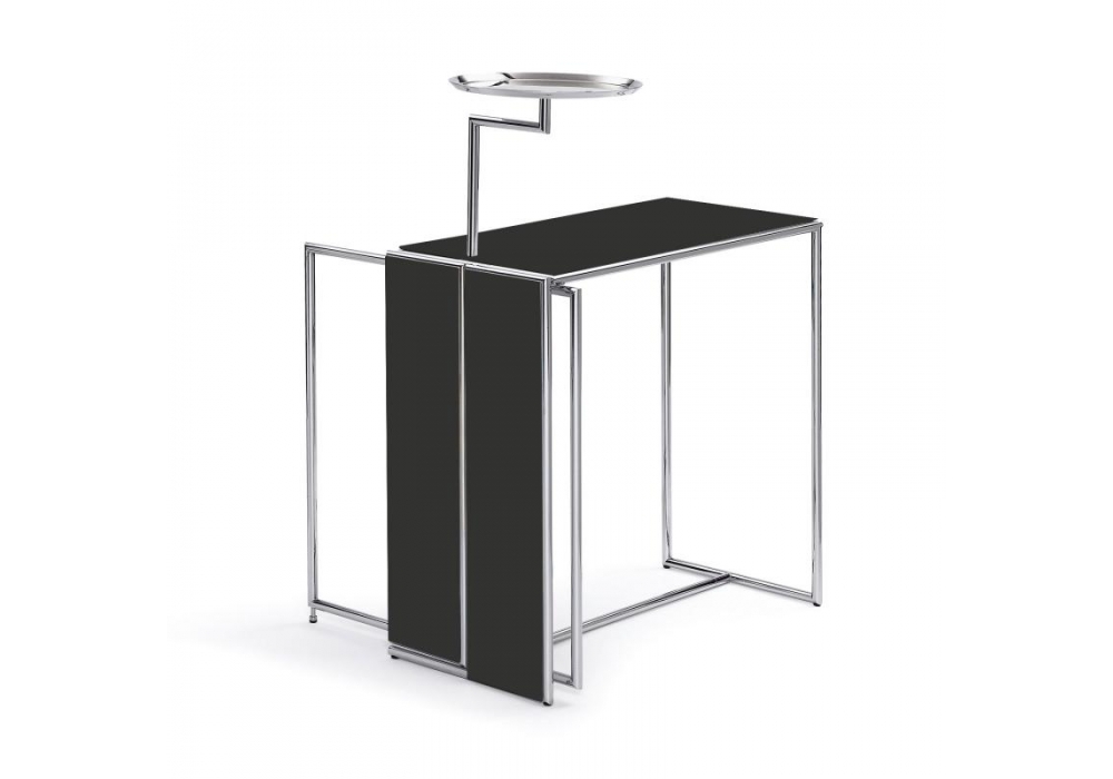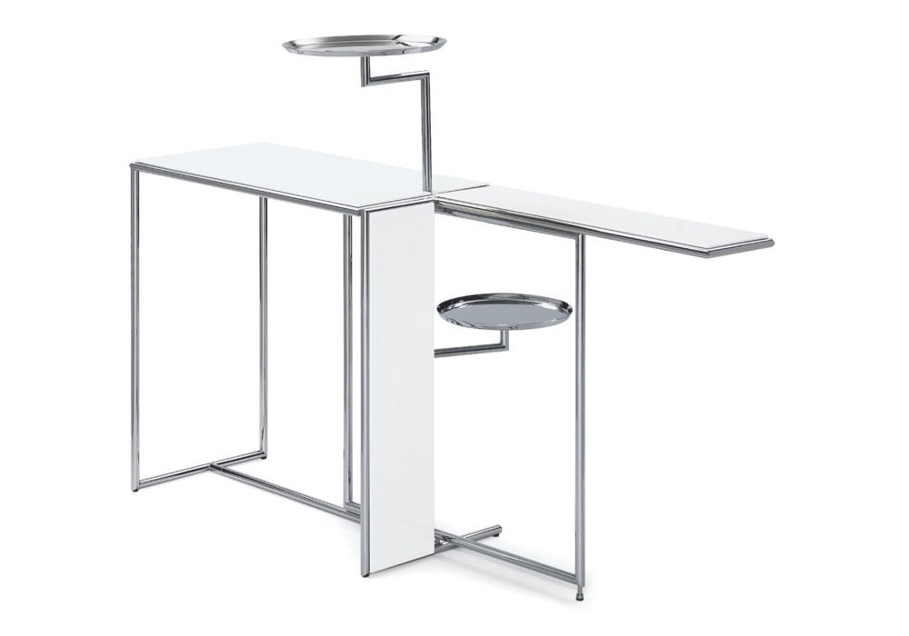 Rivoli diseñada por Eileen Gray para ClassiCon es una hermosa mesa auxiliar con tableros plegables y dos bandejas giratorias. Estructura y bandejas de acero cromado. Tableros de MDF lacados en brillo intenso. Disponible en diferentes acabados.