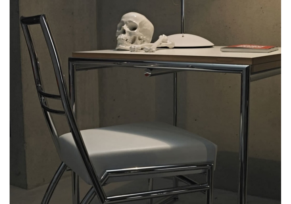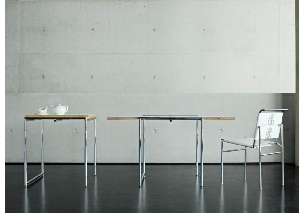 Jean diseñada por Eileen Gray para ClassiCon es una mesa plegable con estructura de tubos de acero cromado. Tablero recubierto de melamina blanca con cola maciza de haya.