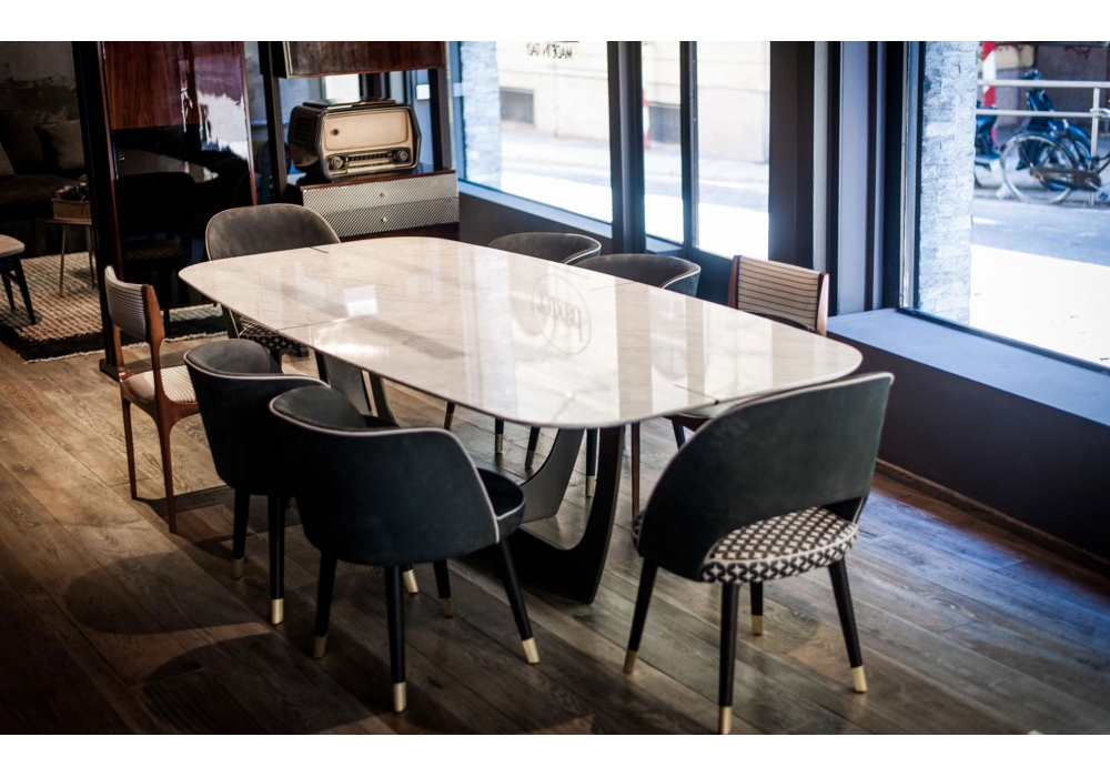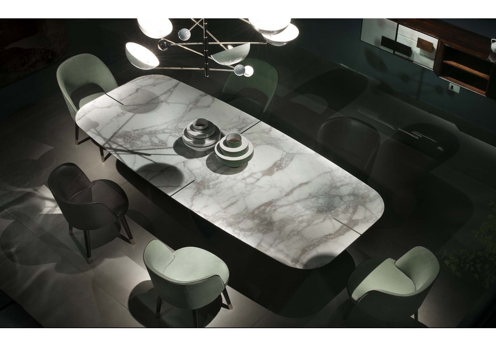 Romeo diseñada por Roberto Lazzeroni para Baxter es una hermosa mesa con base en metal satinado de latón, en metal bruñido acabado a mano o en metal níquel con barniz mate, cortada a láser de 1,5 cm ½" de grosor. Tablero de piedra o en madera recubierto de piel con insertos decorativos siguiendo el acabado y el posicionamiento de la base. Tableros brillantes: mármol Blanco Gioia, mármol Gold Calacatta, granito Elegant Brown, cuarcita Geode. Los bloques y las losas varían visiblemente ya que son piedras naturales; todas las imágenes son una guía aproximada.