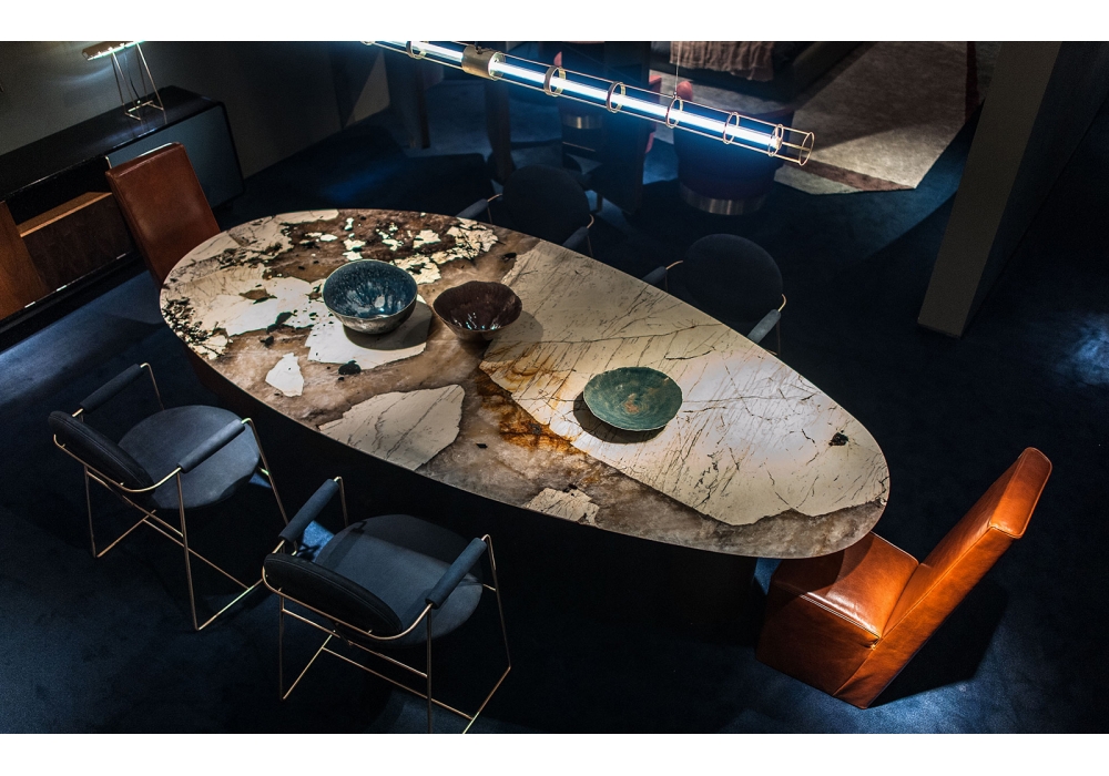 Lagos diseñada por Baxter P. para Baxter es una mesa con patas cilíndricas de diferentes dimensiones, realizadas con una estructura MDF teñida en negro, recubierta de latón antiguo o hierro antiqued. Superficie de piedra con apoyo en chapa barnizada.