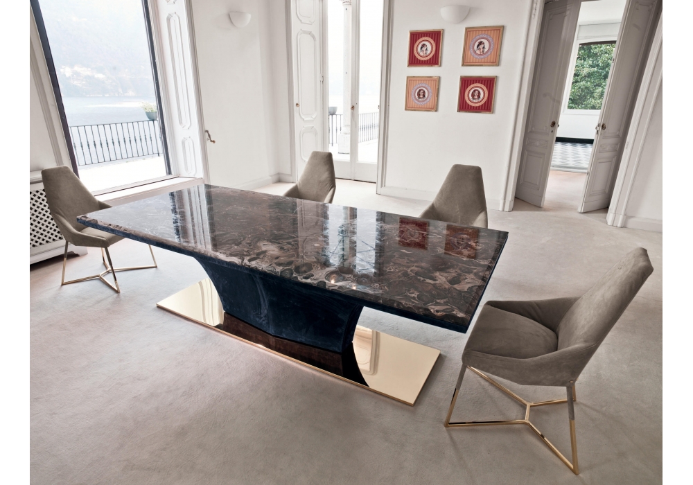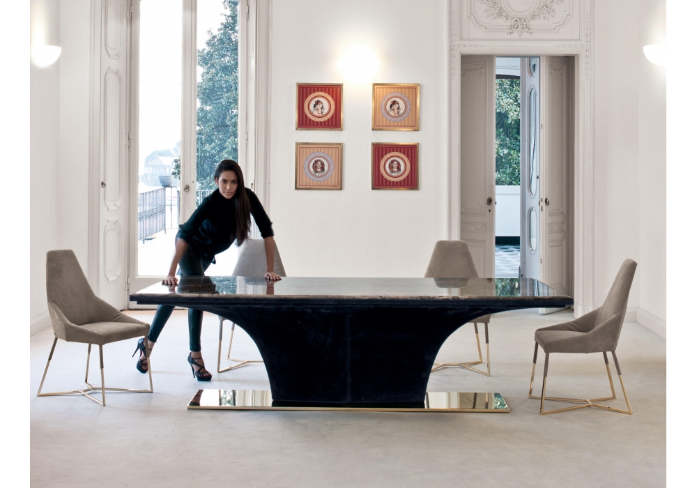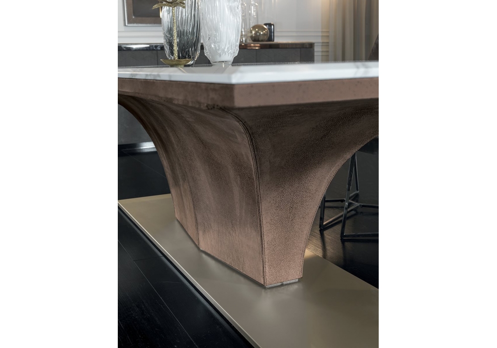 Omotesando diseñada por Silvia Musetti para Longhi es una mesa con base en metal brillante o mate, estructura externa en madera revestida en cuero y tapa en mármol, cristal o espejo. Disponible en diferentes medidas y acabados.