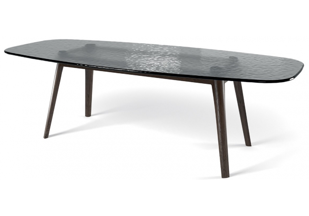 Magma diseñada por Patrick Jouin para Fiam es una mesa con sobre en vidrio fundido y templado de 15 mm, retropintado con acabados semitransparentes o con pinturas metalizadas. Estructura de madera maciza disponible en acabado Tabaco o negro termotratado.