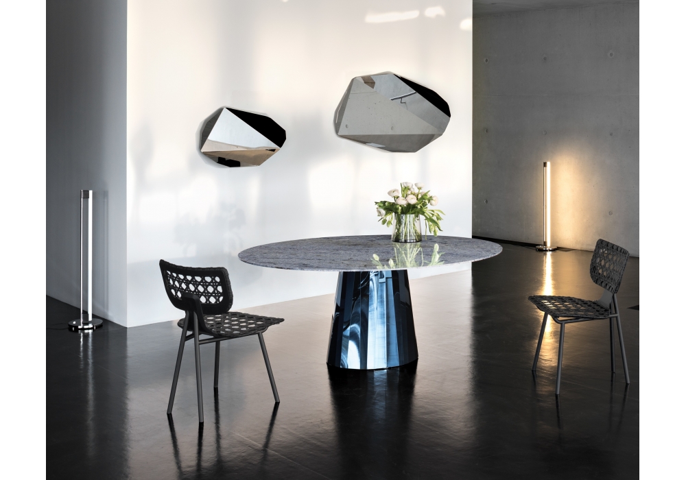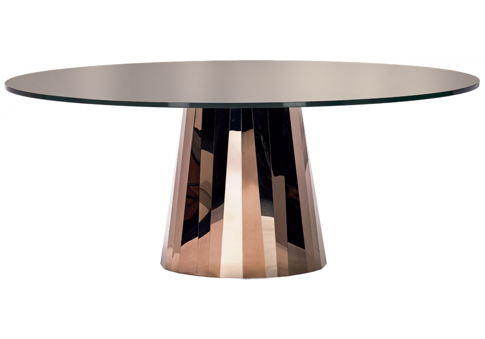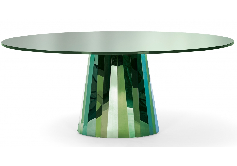 Pli diseñada por Victoria Wilmotte para ClassiCon es una mesa con pie de chapa plegada de acero inoxidable pulido al brillo en diversos colores. La coloración se ha aplicado utilizando un procedimiento especial. Tablero ovalado de cristal, lacado en color axial o en toda la superficie, brillante. Patines regulables en altura. Las cuatro versiones de colores diferentes de la mesa se generan mediante un tratamiento de distinta duración de la superficie, que hace que el acero inoxidable brille con reflejos en verde, azul, marrón rojizo o negro.