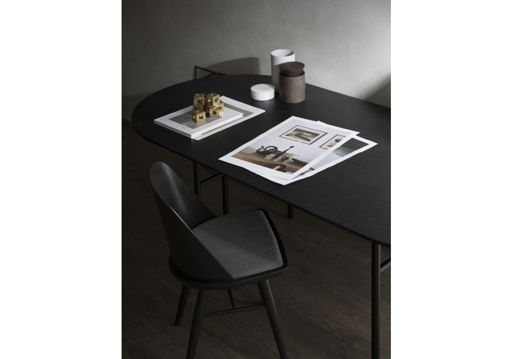 Snaregade Oval diseñada por Norm Architects para Audo Copenhagen es una mesa ovalada con tapa de roble, disponible en diferentes acabados, sobre una base de acero pintado en polvo negro.