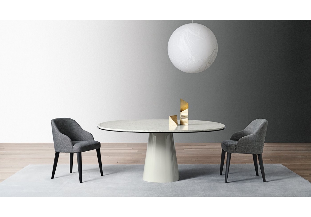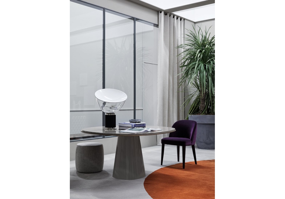 Owen diseñada por Andrea Parisio para Meridiani es una colección de mesas de comedor con base de madera o con plinto en marmol, parte inferior del sobre barnizado latòn bronceado ou barnizado mate black. Sobre enchapado en roble teñido, lacado mate o brillo, marmol.