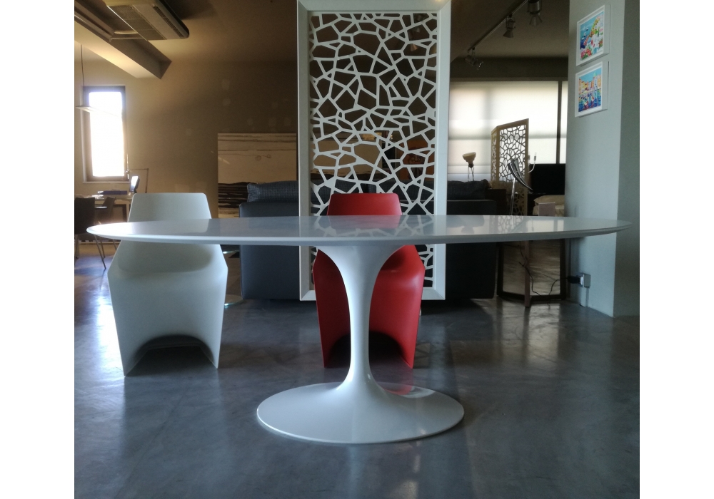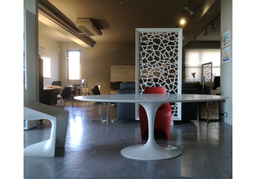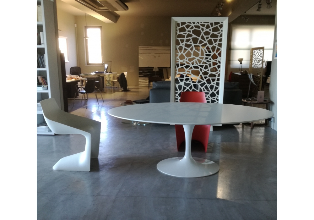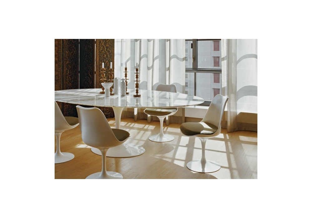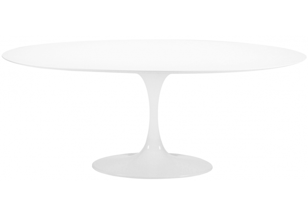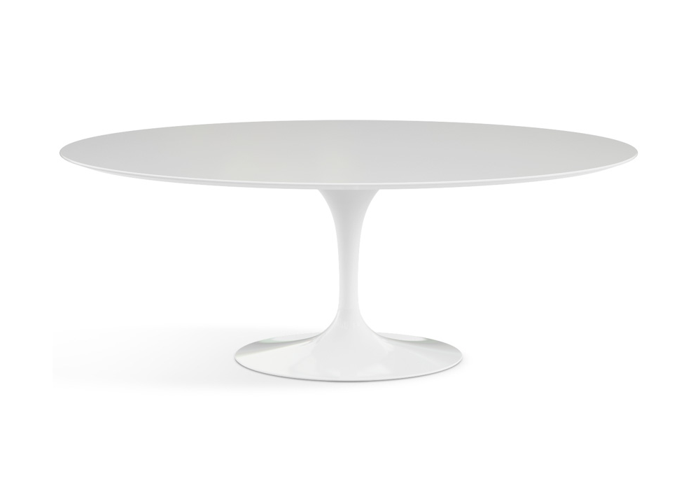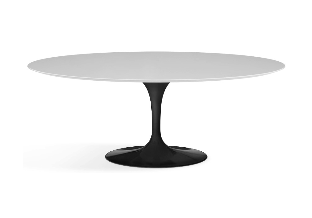 Saarinen diseñada por Eero Saarinen para Knoll es una mesa ovalada con tablero de madera en varios acabados, laminado plástico blanco o fenix negro. Base de aluminio con acabado protector en Rilsan blanco o negro. Disponible en diferentes medidas.