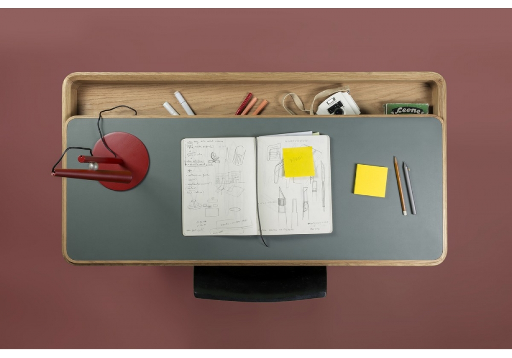 Avio diseñado por Alessandro Stabile para InternoItaliano es uno escritorio en madera de roble maciza caracterizado por un compartimento de almacenamiento en el que se coloca una superficie deslizante cubierta de linóleo gris. Ningún elemento bisagra: el sobre está completamente desabrochado.
