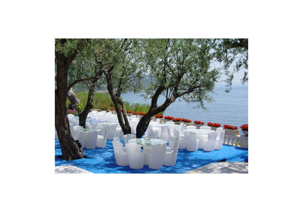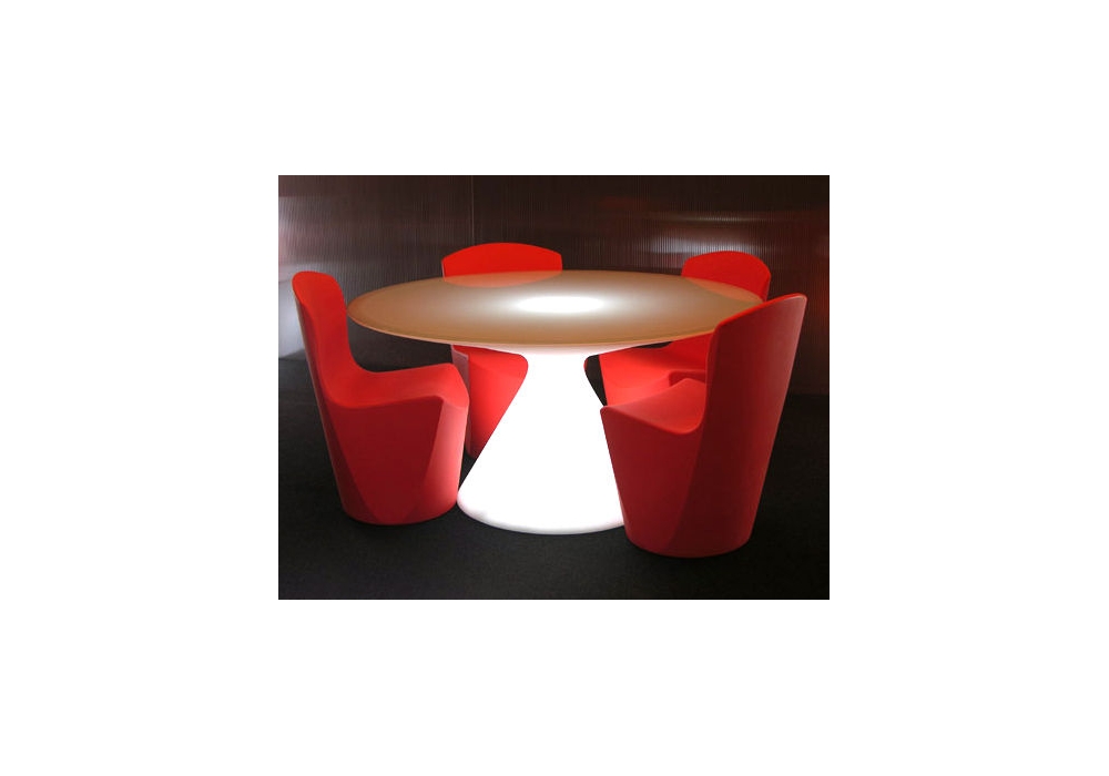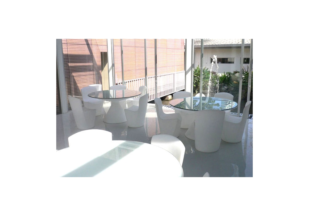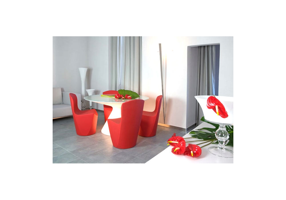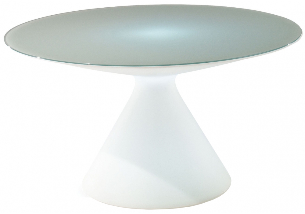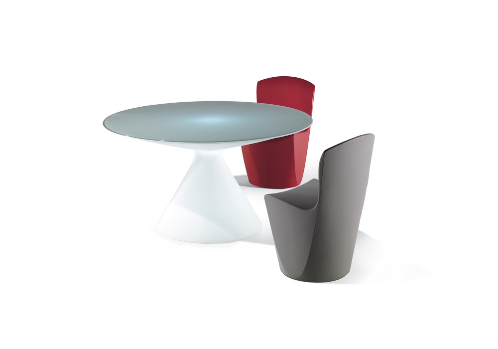 Ed diseñada por Gugliemo Berchicci para Slide es una mesa realizada en polietileno con la superficie en vidrio templado.