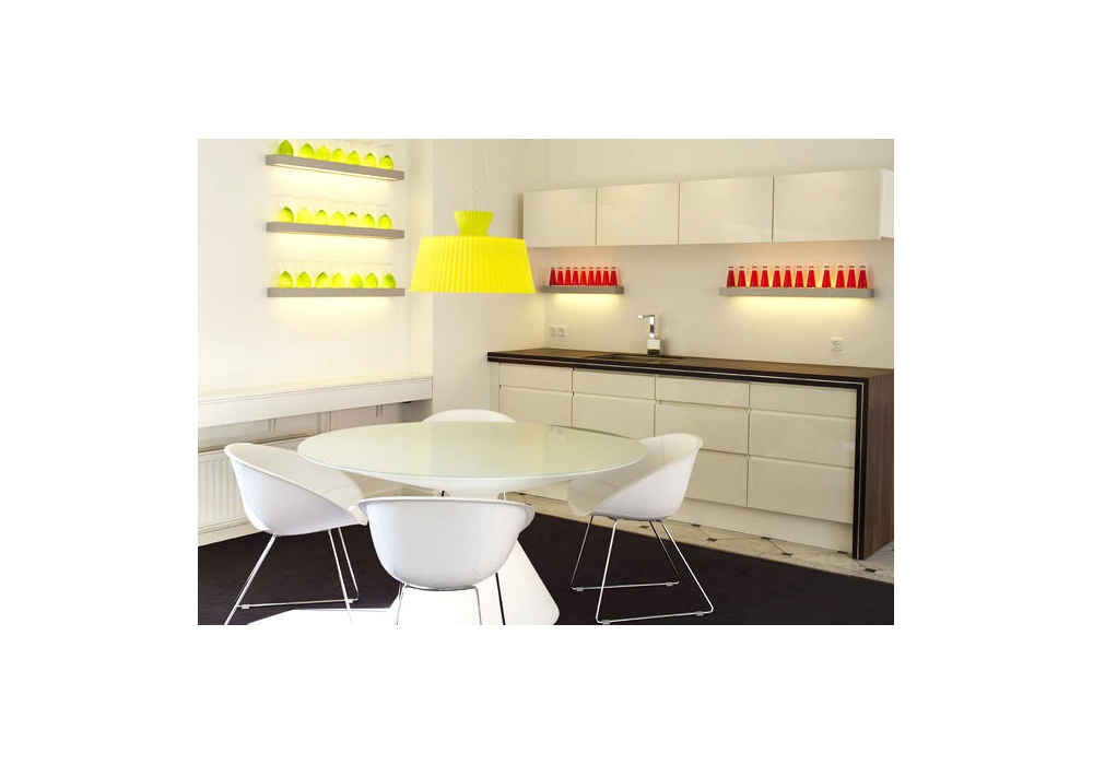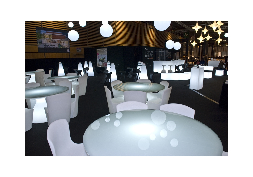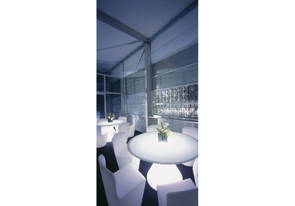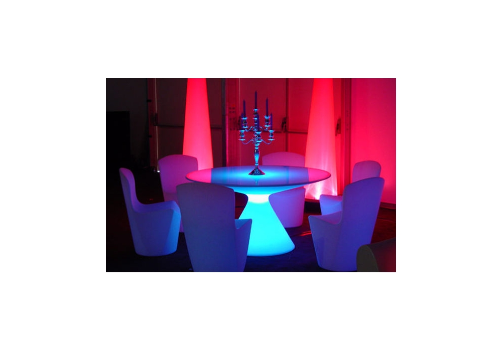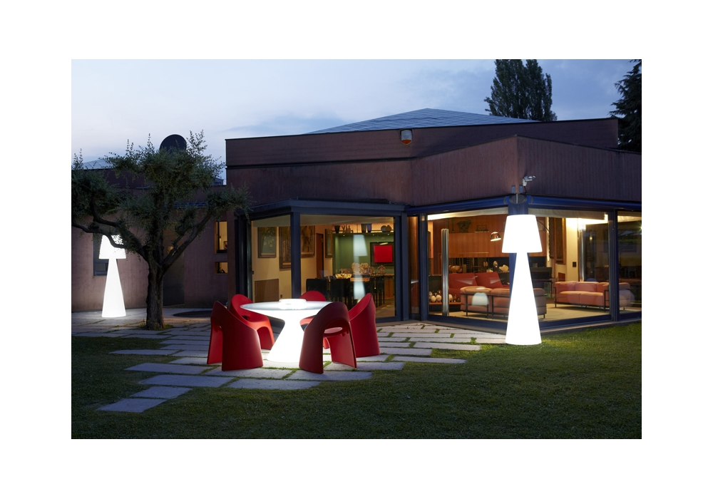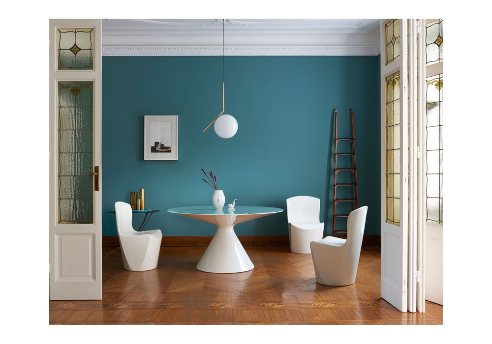 Ed diseñada por Gugliemo Berchicci para Slide es una mesa realizada en polietileno con la superficie en vidrio templado.