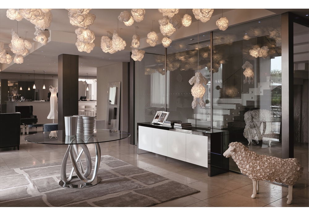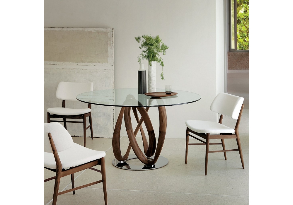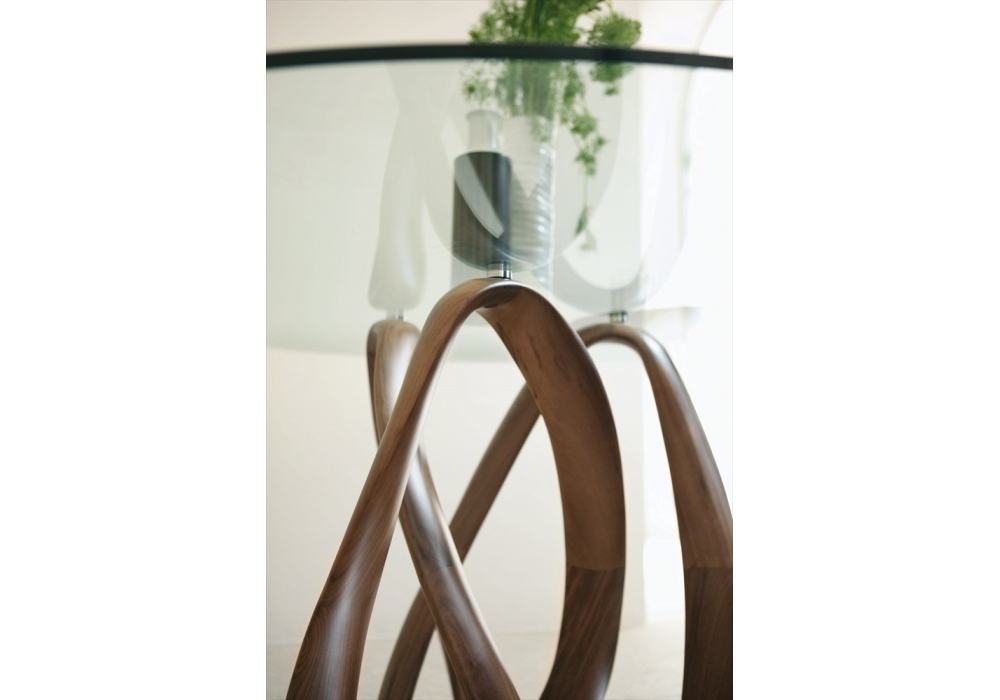 Infinity C diseñada por S. Bigi para Porada es una mesa de comedor con base en nogal canaletta macizo o fresno disponible en diferentes acabados. Tapa en cristal transparente o ahumado (espesor mm. 12). Base montada en un disco de metal. Disponible en diferentes dimensiones.