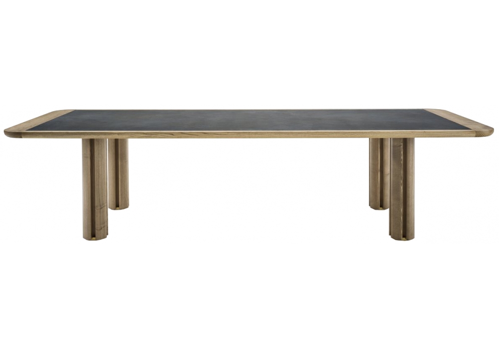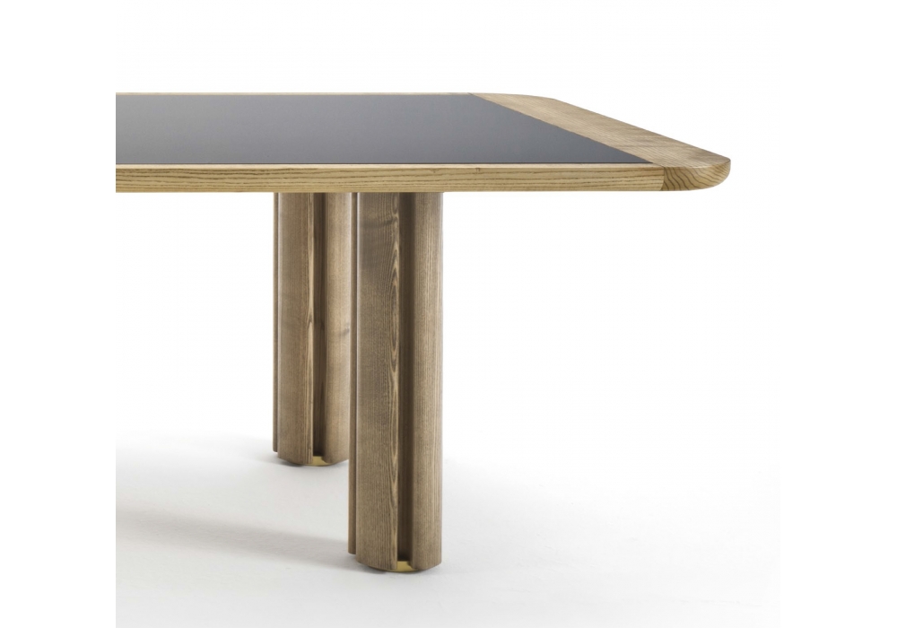 Quadrifoglio diseñada por Carlo Ballabio para Porada es una mesa en madera con patas de latón y el interior de la parte superior en piedra o vidrio. Disponible en diferentes tamaños.