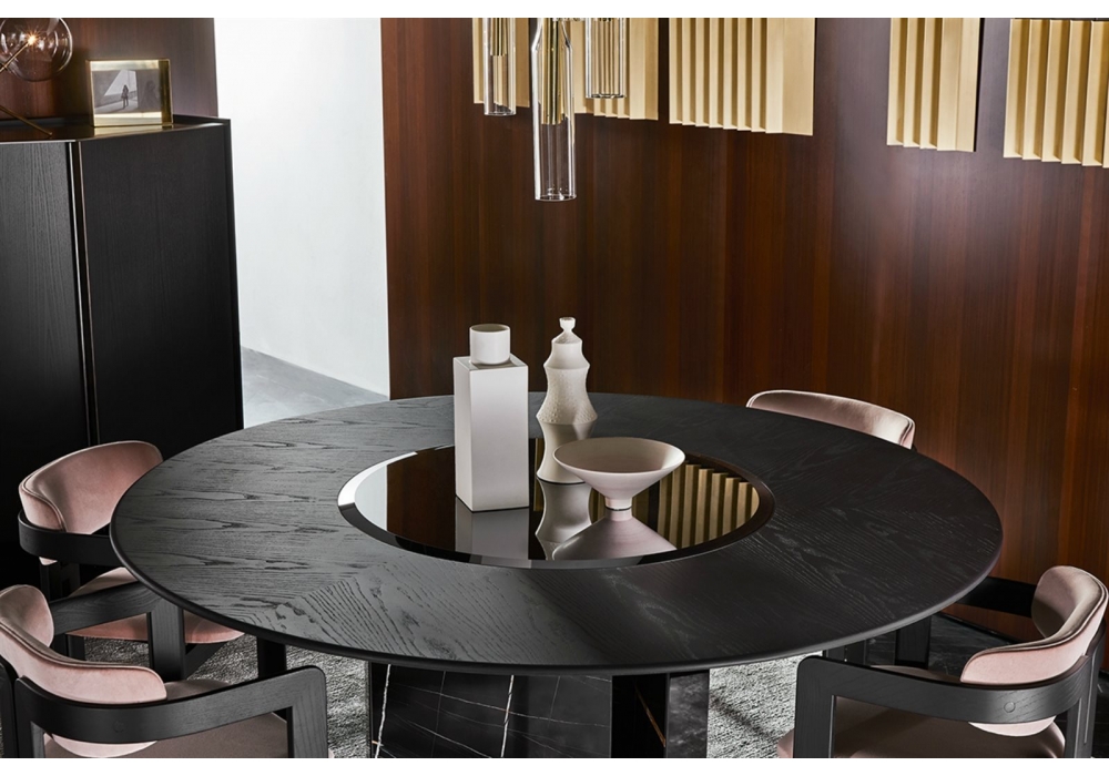 Platium Round diseñada por Oscar & Gabriele Buratti para Gallotti&Radice es una mesa redonda con superficie en fresno cepillado teñido negro. Bandeja giratoria de 10mm en vidrio templado biselado pintado negro brillante. Base en mármol Sahara Noir. Placa inferior en acero inox brillante “Supermirror”.