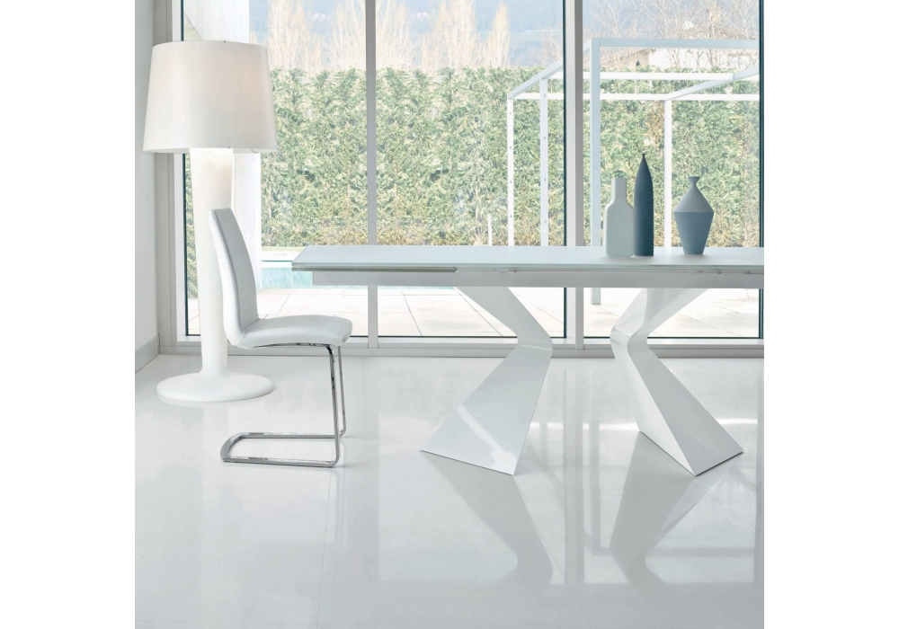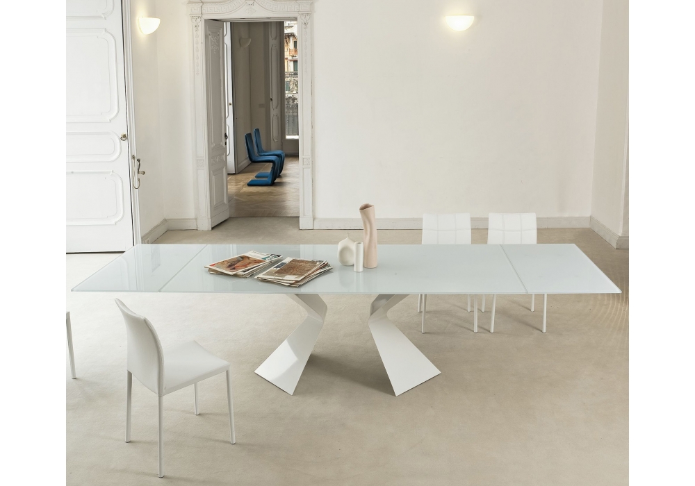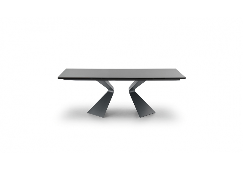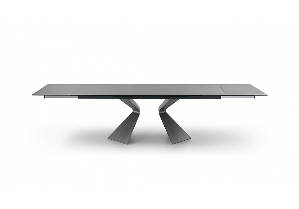 Prora diseñada por Mauro Lipparini para Bonaldo es una mesa extensible con estructura y base central en metal y tablero/extensiones en madera lacada, cristal o cerámica, disponible en diferentes acabados.
