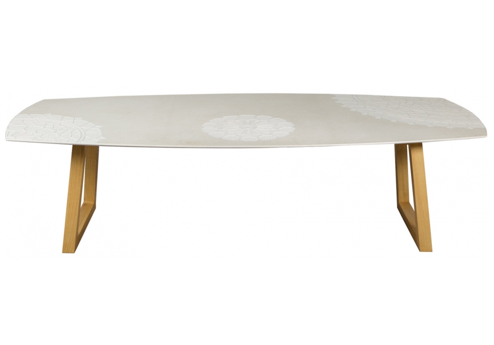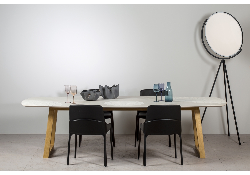 Tavoliranni diseñada por Marella Ferrera para Lithea es una mesa de comedor de mármol o piedra y base en madera. También disponible en 3 medidas.
