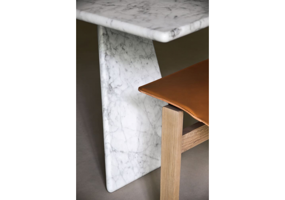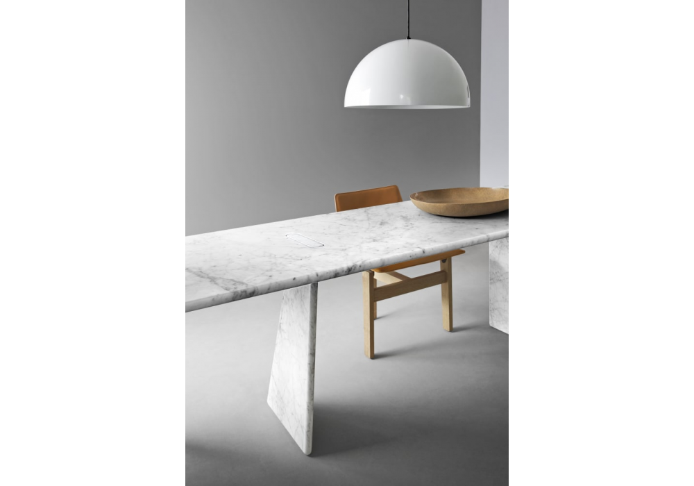 Asolo diseñado por Angelo Mangiarotti para Agapecasa es una colección de mesas de mármol con dos patas de forma trapezoidal. El mármol disponible en los siguientes acabados: Carrara blanco, Marquinia negro, Carnico gris, Alpi verde y Emperador Dark. Disponible en cuatro dimensiones.