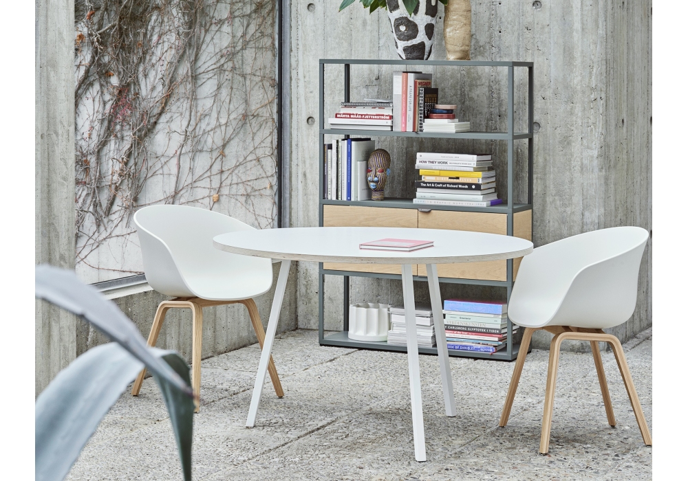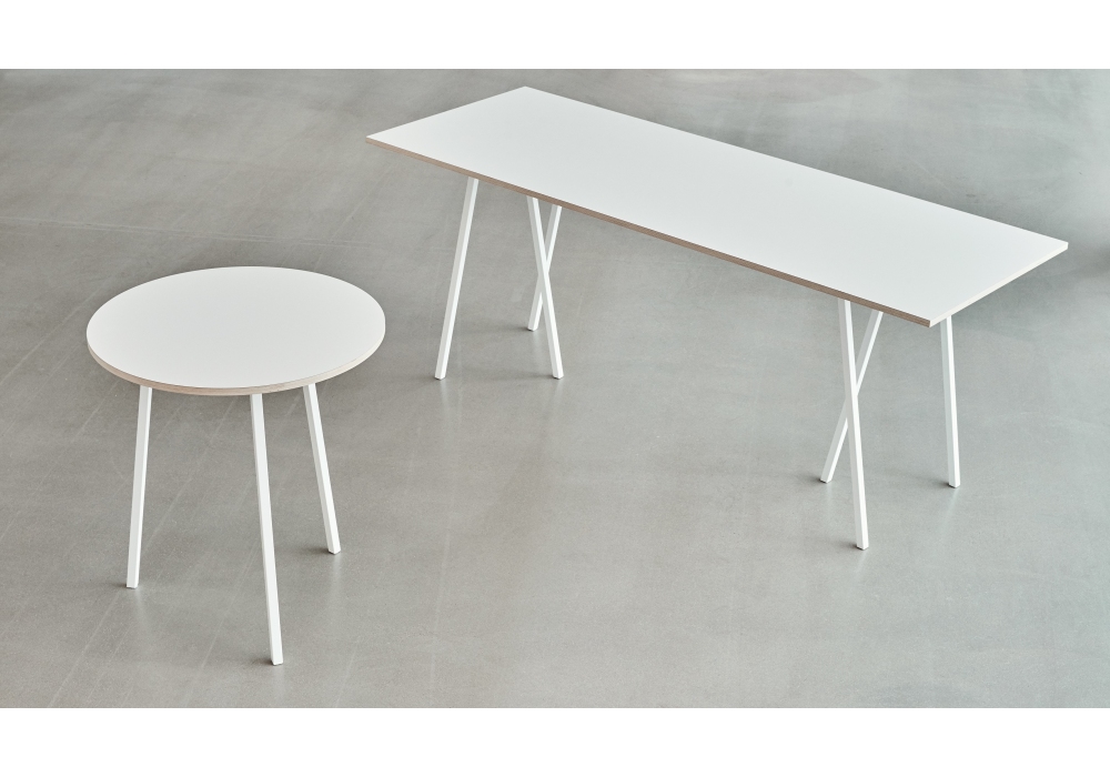 Loop Stand Round diseñada por Leif Jørgensen para Hay es una mesa con tablero en laminado blanco o linóleo negro y patas de aluminio pintado en polvo a juego. Disponible en diferentes medidas y acabados.