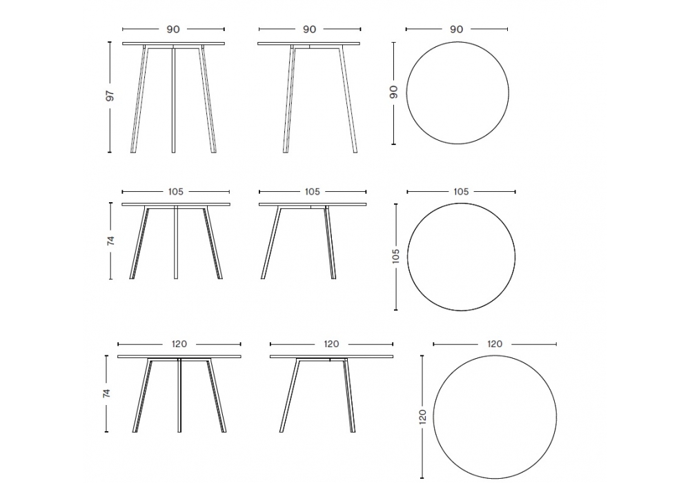 | Dimensiones | Ø 90 x H 97 cm; Ø 105 x H 74 cm; Ø 120 x H 74 cm. |