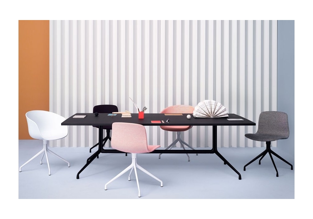 About a Table AAT 10 diseñada por Hee Welling & Hay para Hay es una mesa con tablero de linóleo o laminado con bordes redondeados y patas de aluminio con recubrimiento en polvo. Disponible en diferentes acabados y tamaños.