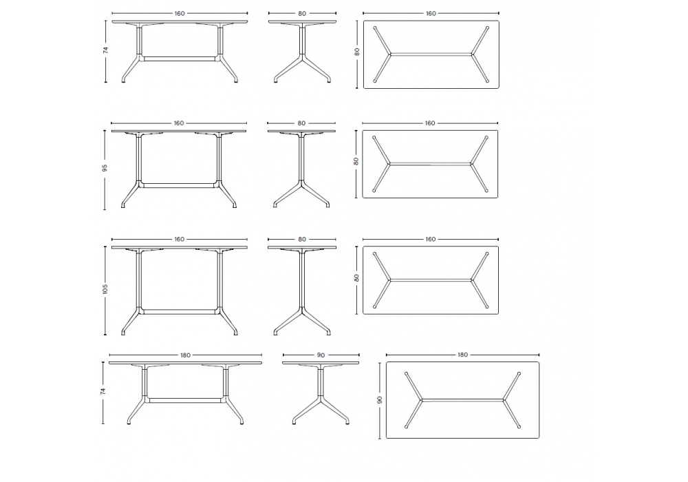 | Dimensiones | - 160 x 80 x H 74 cm; - 160 x 80 x H 95 cm; - 160 x 80 x H 105 cm; - 180 x 90 x H 74 cm; - 180 x 105 x H 74 cm; - 220 x 90 x H 74 cm; - 220 x 105 x H 74 cm; - 280 x 90 x H 74 cm; - 280 x 105 x H 74 cm. |
