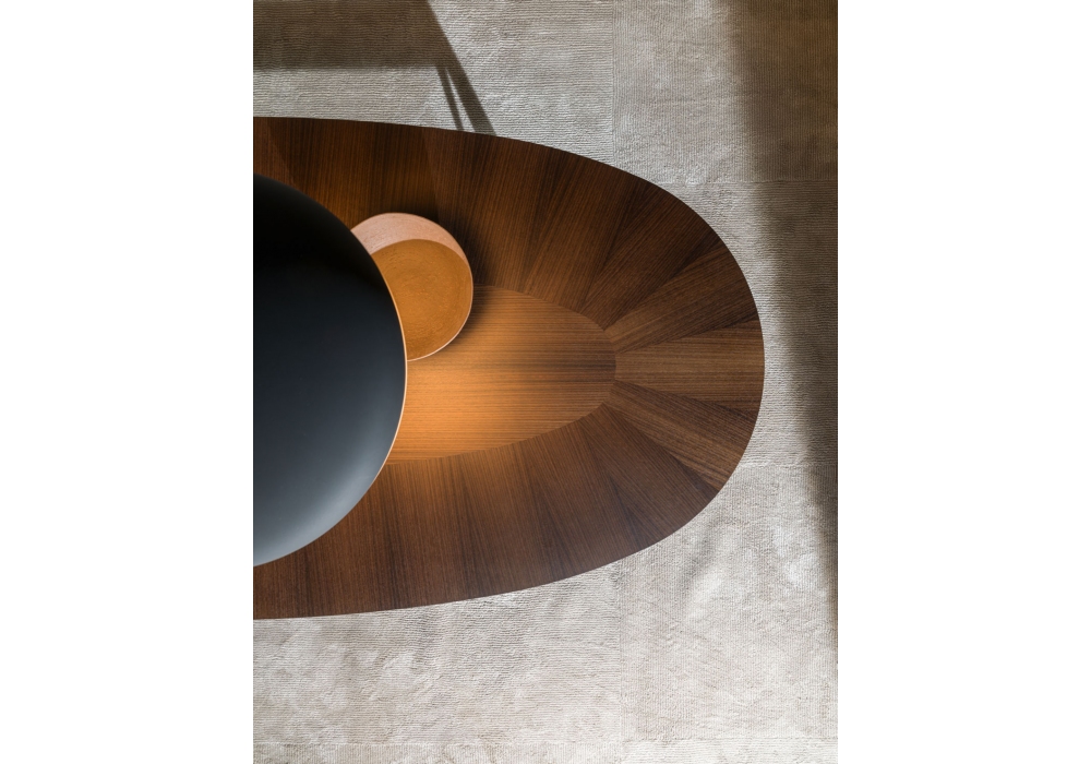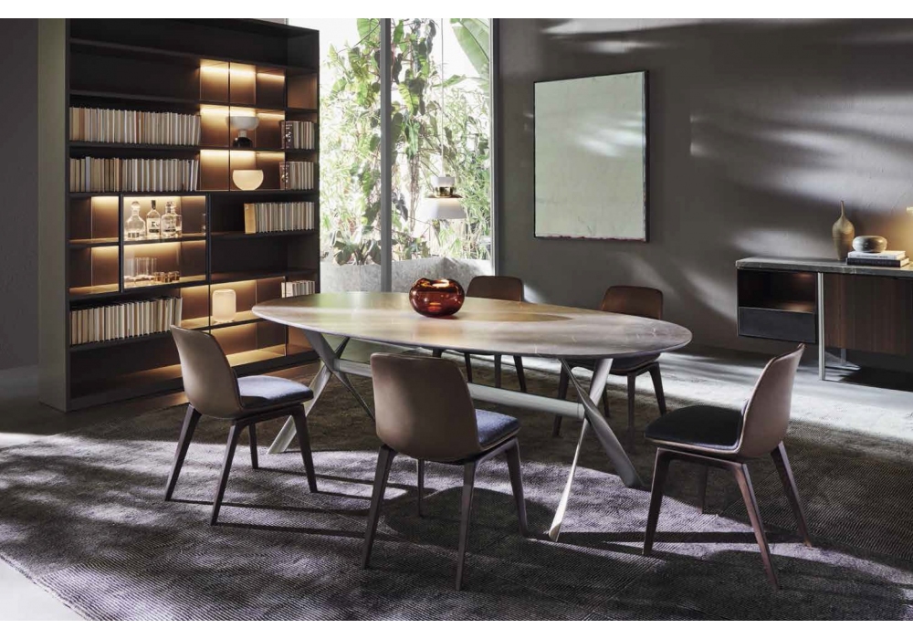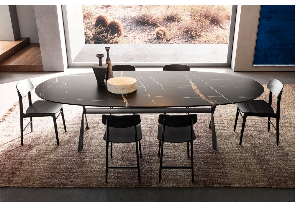 Gatwick diseñada por Rodolfo Dordoni para Molteni&C es una mesa con tapa ovalada realizada en mármol o madera y estructura de metal. Disponible en diferentes acabados y dimensiones.
