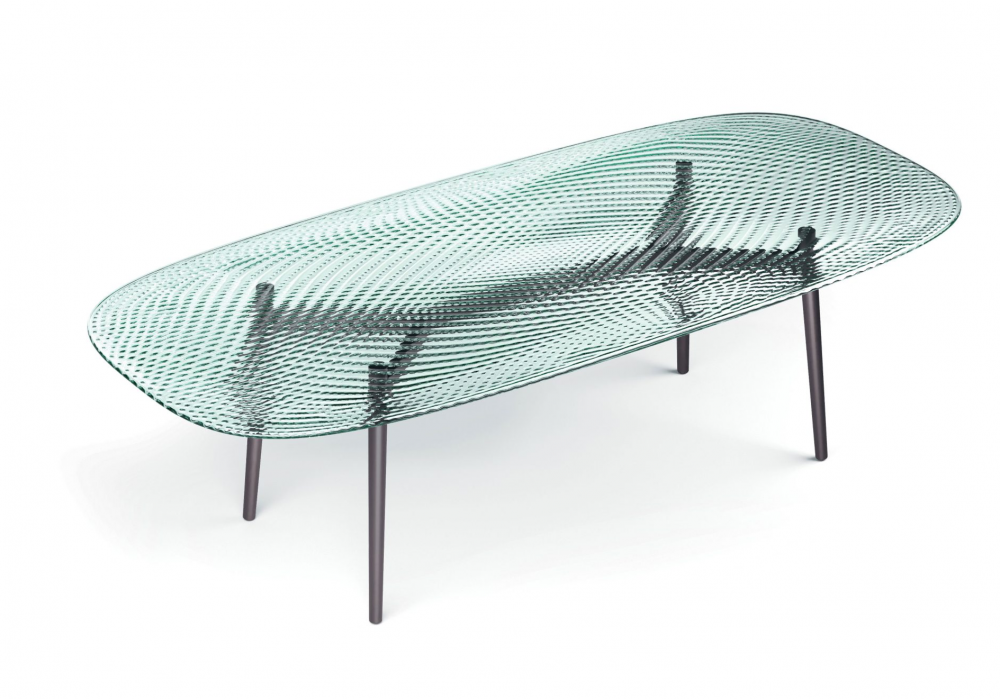 Coral Beach diseñada por Mac Stopa para Fiam es una mesa con sobre en vidrio fundido y templado, disponible transparente o retrolacado con pinturas metalizadas. Base en metal pintado Gris Lava o Greige metalizado.