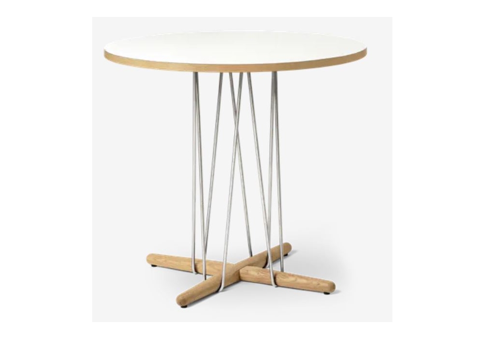 E020 Embrace Table diseñada por Eoos para Carl Hansen & Søn es una mesa con tapa laminada en blanco o negro, estructura en acero inoxidable o acero pintado en polvo negro, base en roble macizo o nogal en diferentes acabados. Disponible en tres tamaños.