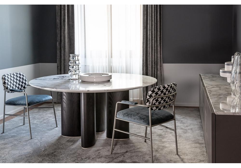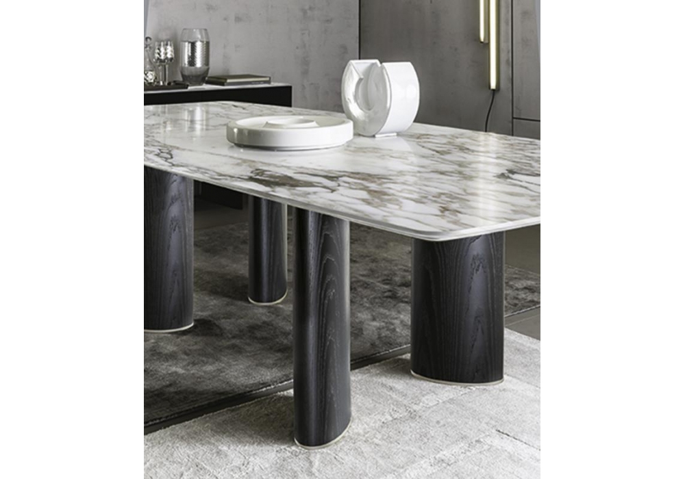 Arne diseñada por Roberto Lazzeroni para Casamilano es una mesa con sobre en mármol y bajo en MDF lacado. Las patas ovaladas están recubiertas de cuero, lacadas o de fresno flameado.