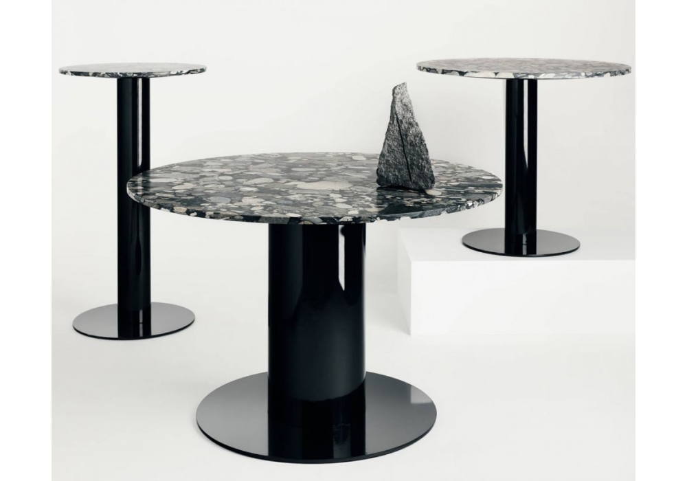Tube Wide diseñada por Tom Dixon es una mesa con tapa redonda de mármol, disponible en diferentes acabados. Pata y base de metal en acabado negro brillo.
