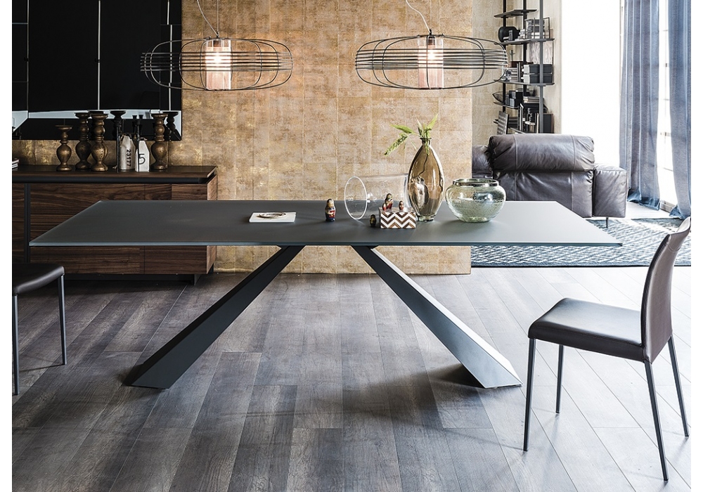 Eliot diseñada por Giorgio Cattelan para Cattelan Italia es una mesa con base en acero y tapa en cristal extra transparente de 12 mm de espesor. Disponible en 4 tamaños. La parte superior de vidrio 240 x 120 tiene un espesor de 15 mm.