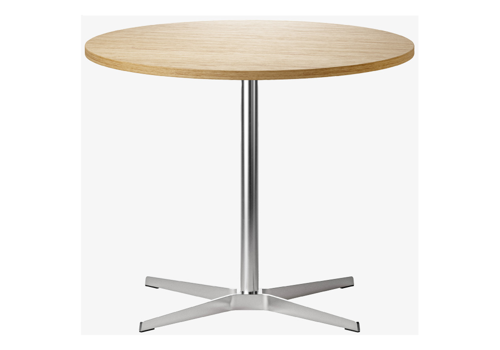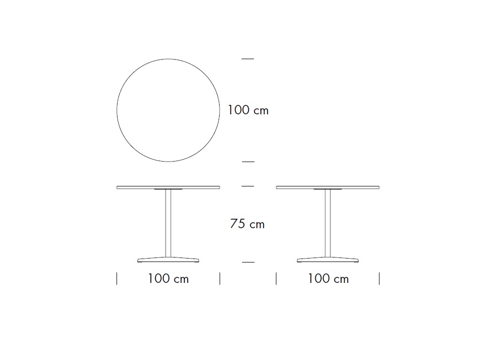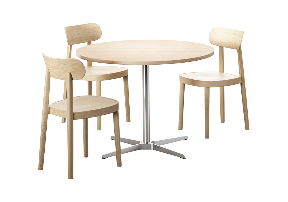 1818 diseñada por Formstelle para Thonet es una mesa de comedor redonda con estructura en acero cepillado, tablero de varias medidas en haya, roble, nogal o laminado.