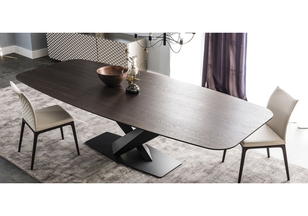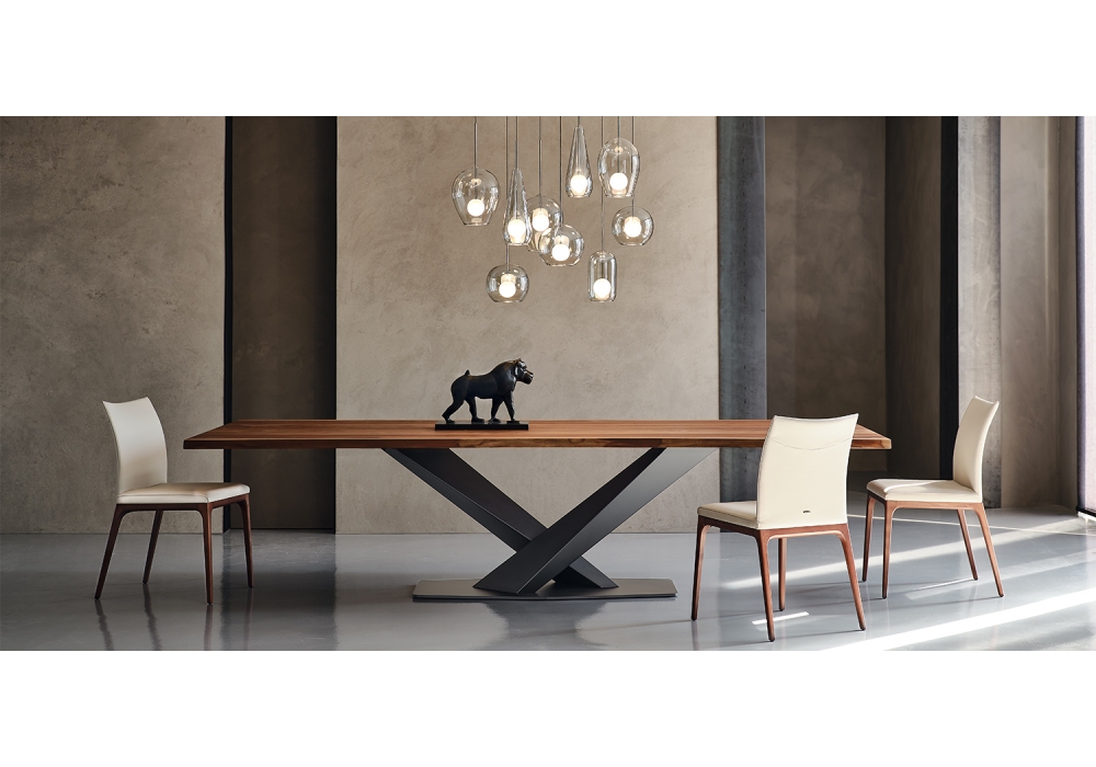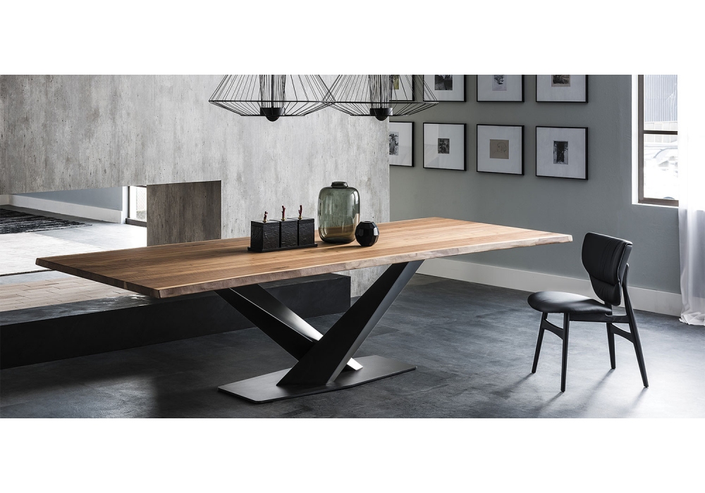 Stratos Wood diseñada por Studio Kronos para Cattelan Italia es una mesa con base en acero barnizado gofrado. Versión "S" con bordes irregulares de madera maciza en nogal Canaletto, roble ahumad) o roble natural grosor 4 cm. Versión "A": sobre en nogal Canaletto, roble ahumado o roble natural con bordes oblicuos. Sobre 200x100 con grosor 4 cm, sobre medidas 240x120 y 300x120 grosor 5 cm. Versión "B": sobre con bordes biselados en nogal Canaletto o roble ahumado. Versión “Masterwood”: sobre en forma de barco en Nogal Canaletto o roble ahumado realizado con láminas de madera en posición diagonal. Cantos oblicuos y redondeados hacia abajo.