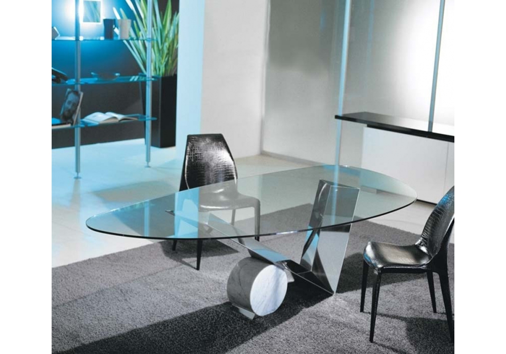 Valentinox diseñada por Emanuele Zenere para Cattelan Italia es una mesa realizada con base en acero inoxidable pulido, cilindro en travertino o mármol y tapa en cristal transparente. Disponible en varios acabados y 5 modelos.