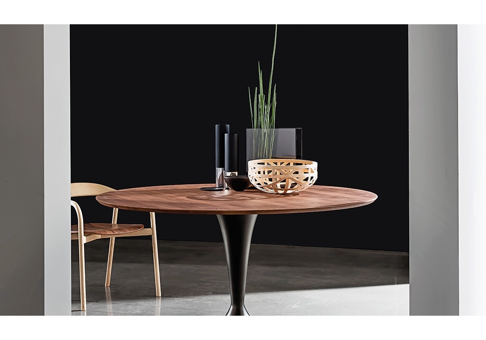 Flûte diseñada por Studio Sovet para Sovet es una mesa con tablero de madera y base de metal. Disponible en diferentes acabados y dimensiones.
