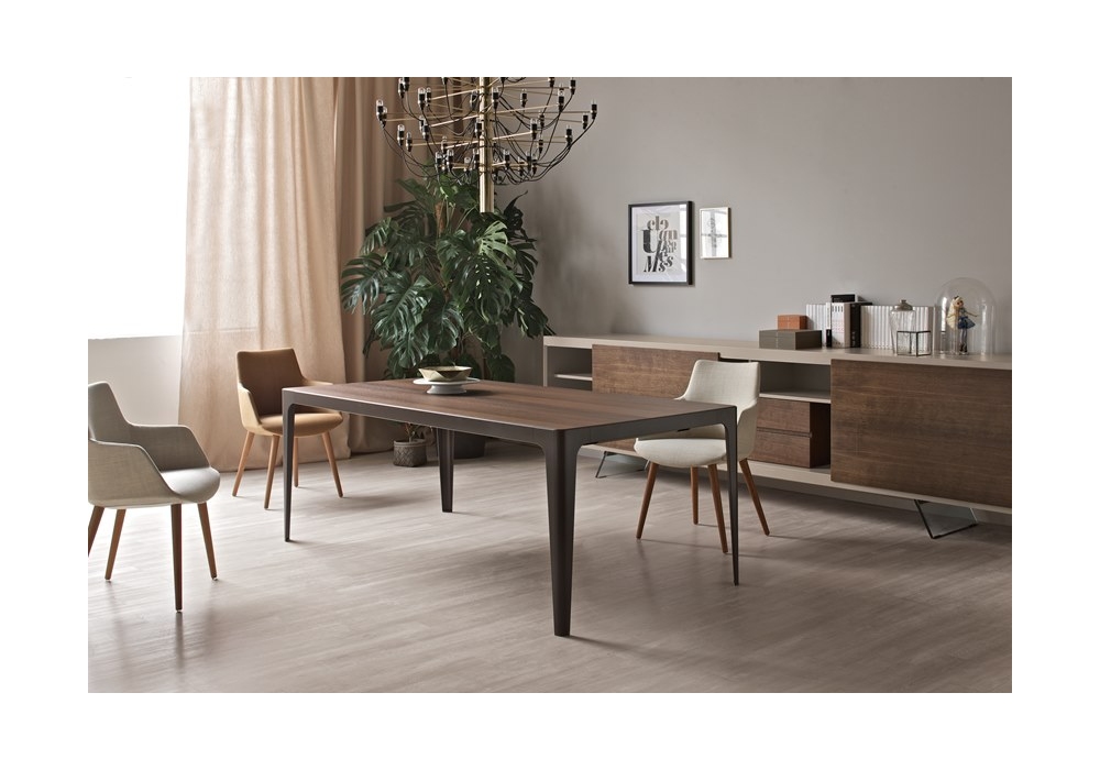 Grand More diseñada por Estel R&D es una mesa con patas de metal, perfiles de aluminio y tapa en esencia de laminado, madera, cerámica o vidrio. Disponible en diferentes acabados y también en versión extensible.