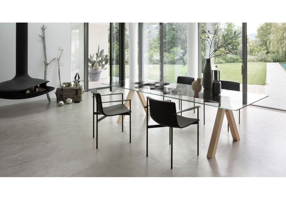 Sesto diseñada por Piero Lissoni para Lema es una mesa realizada con viga de metal gris oscuro, estructura en fresno macizo de roble tratado térmicamente o fresno natural y tapa en cristal transparente extraclaro. Disponible en diferentes dimensiones.