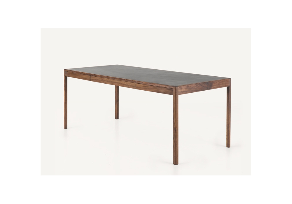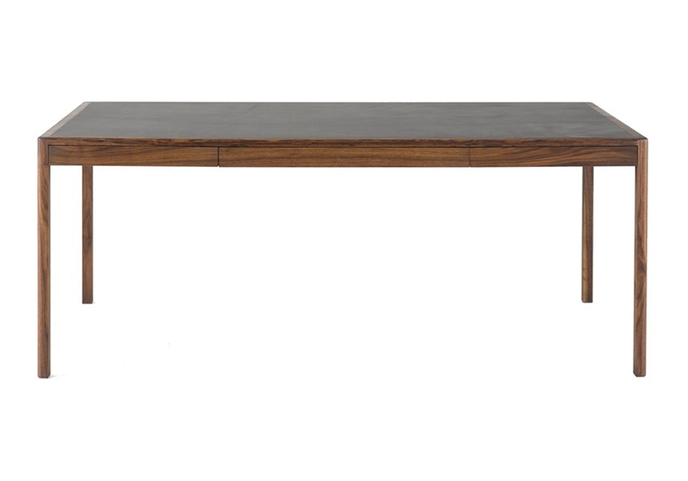 Escritorio de cuero diseñado por Craig Bassam para BassamFellows, disponible en diferentes acabados de madera, compuesto por una estructura muy simple pero refinada, con 3 cajones retráctiles, de líneas limpias y esenciales, todo sostenido por 4 patas de madera.