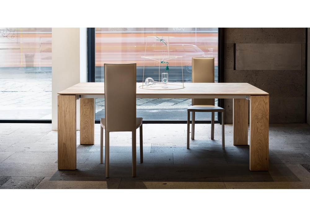 Atlante diseñada por Riflessi es una mesa extensible de madera realizada con patas de caballete y mecanismo de extensión en aluminio anodizado. Disponible en diferentes acabados y dimensiones.