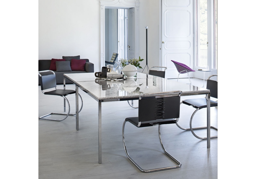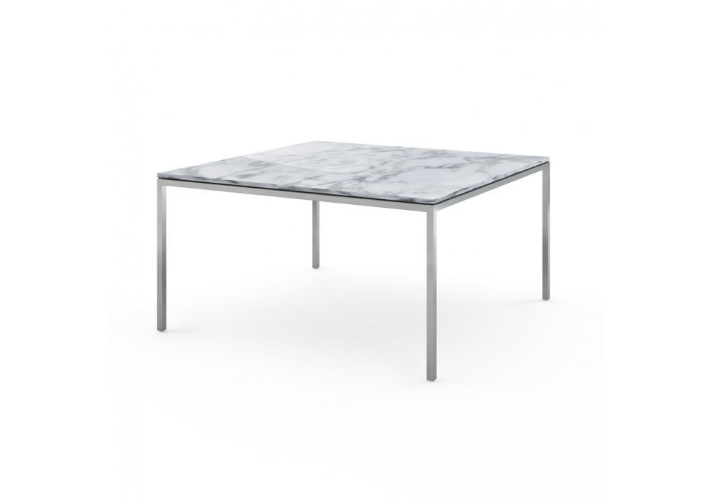 Florence diseñada por Florence Knoll para Knoll es una mesa con estructura de acero soldado y acabado cromado pulido o pintado en negro. Tablero realizado en cristal transparente, madera de roble o mármol en varios acabado.