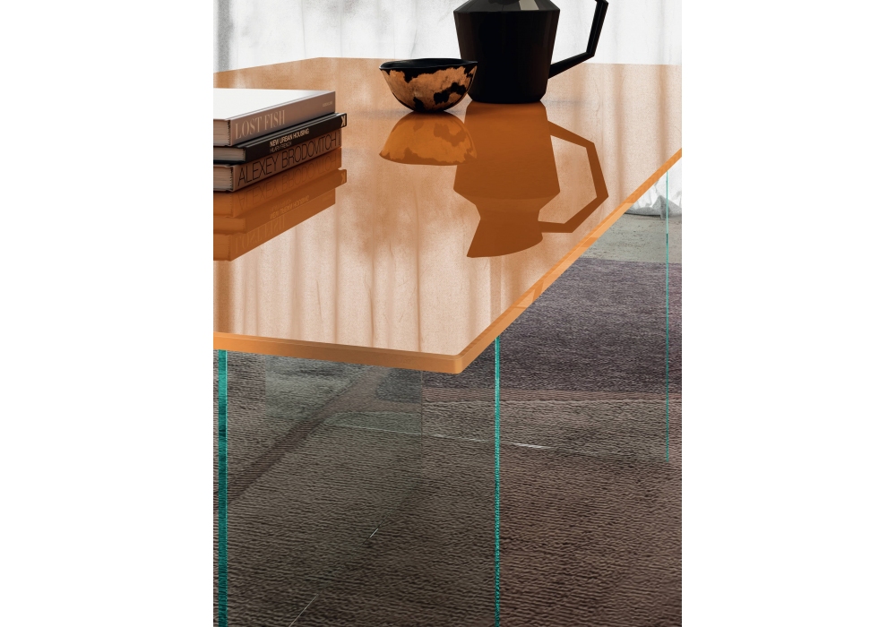 Air Slim Glass diseñada por Daniele Lago para Lago es una mesa con tablero de cristal lacado y patas de cristal extraclaro o gris ahumado. Disponible en diferentes acabados y dimensiones.