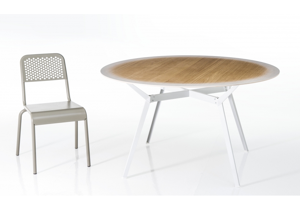 Pylon Gradient diseñada por Diesel Creative Team para Diesel con Moroso es una mesa redonda con tratamiento degradado negro o gris RAL 7035 sobre tablero de roble. Base barnizada crudo negro o gris RAL 7035. Deslizadores en polipropileno.