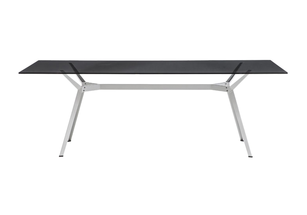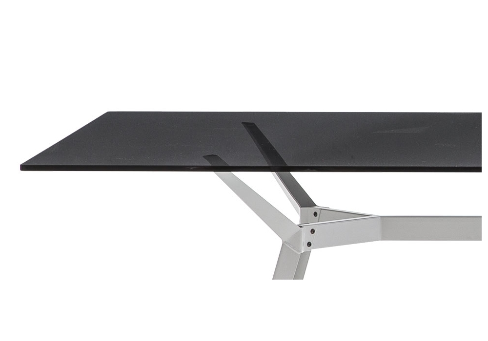 Pylon diseñada por Diesel Creative Team para Diesel con Moroso es una mesa con tablero en vidrio plano color humo negro, base en acero barnizado con acabado gris RAL 7035 y travesaño en acero con acabado cromado. Desliza en polipropileno.