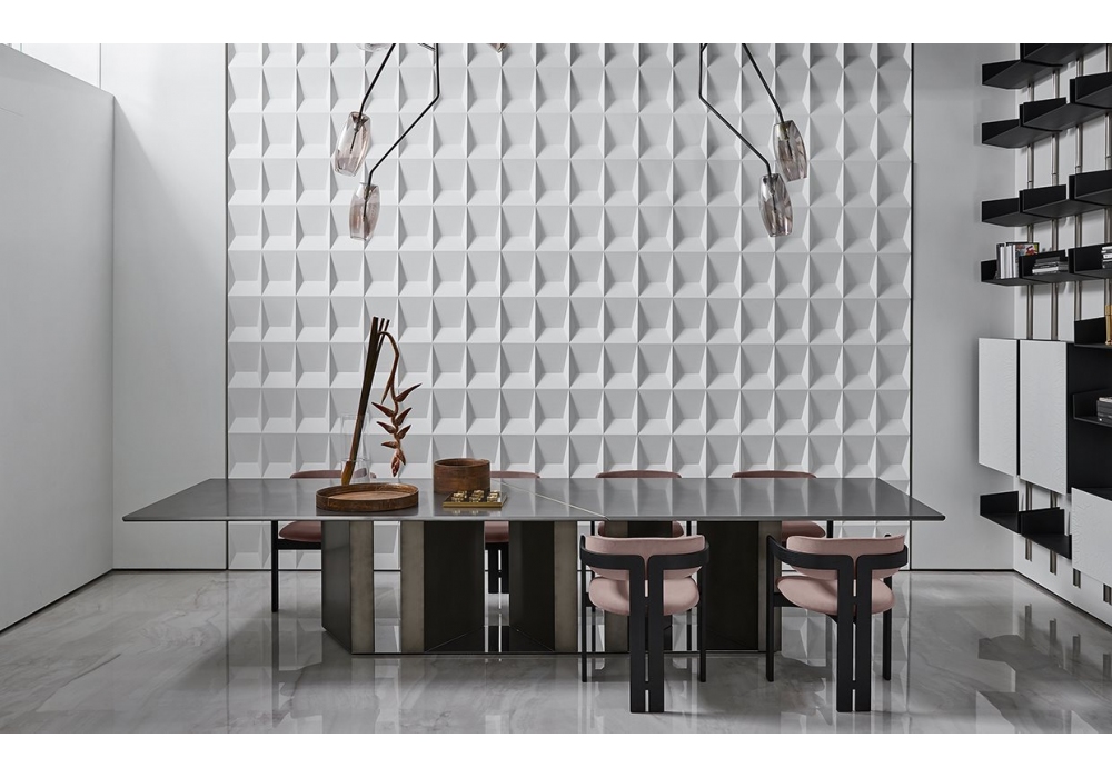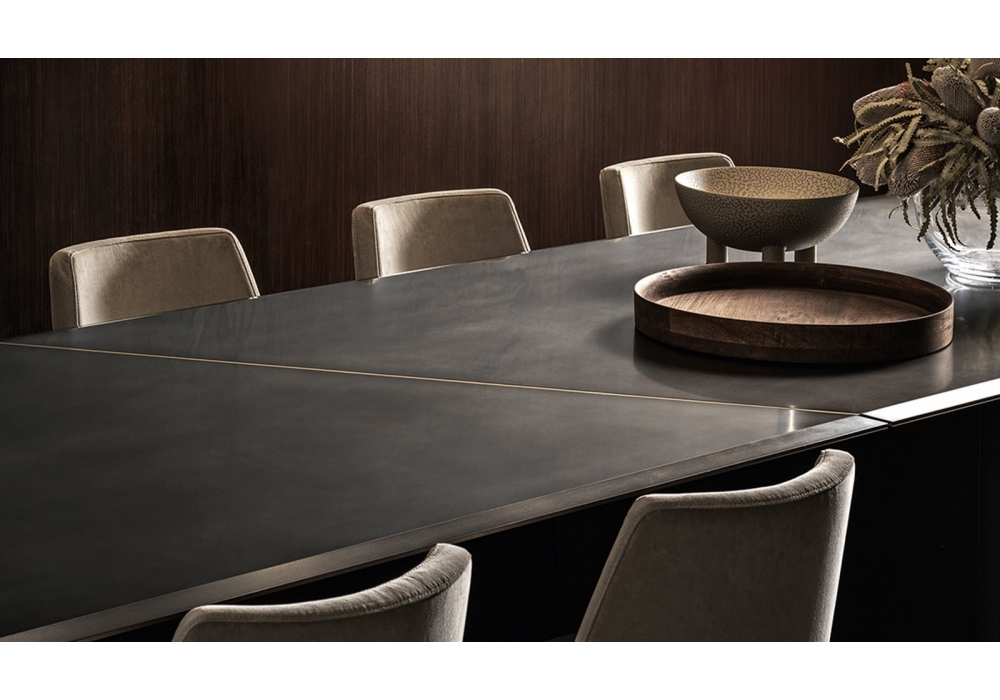 Platium System diseñada por Oscar & Gabriele Buratti para Gallotti&Radice es una mesa con superficie modular en vidrio de 15mm de espesor y base en madera recubierta de vidrio de 6mm de espesor, decorada a mano con exclusivo acabado en bronce antiguo y plomo. También disponible versión con cristal pintado bronce patinado. Importante bisel de 4cm solo en dos bordes de la superficie. Detalle de la unión entre las superficies en latón satinado. Placa debajo de la base en acero inox brillante "supermirror". Versión disponible con base en madera revestida de mármol Sahara Noir, Stardust Grey o Calacatta Vagli Oro de 20mm de espesor.
