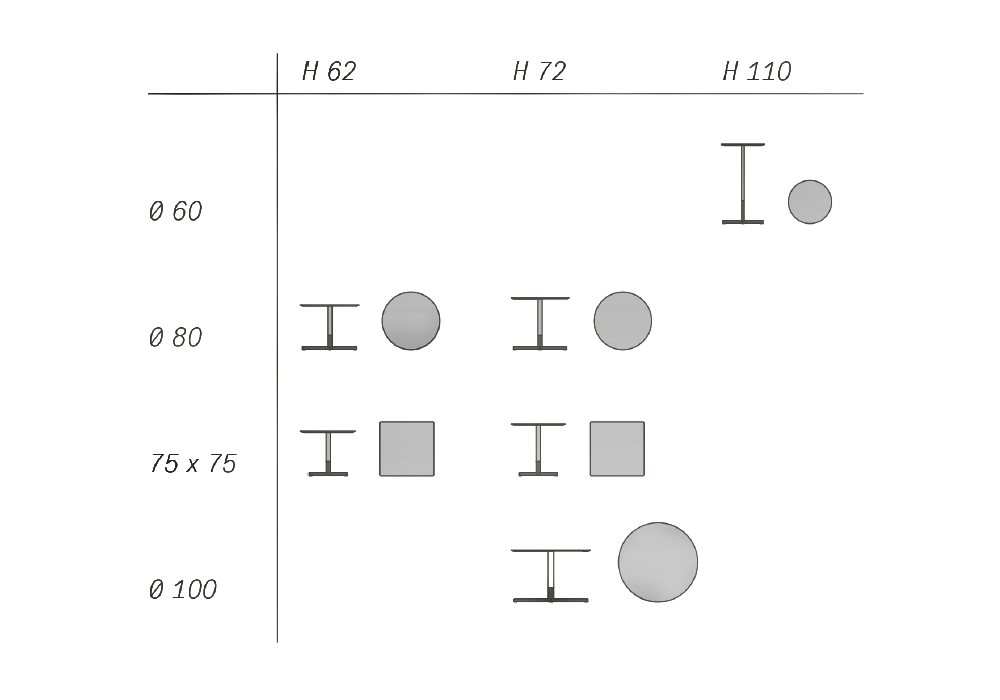 | Dimensiones | • Ø 60 x H 110 cm; • Ø 80 x H 62 cm; • Ø 80 x H 72 cm; • 75 x 75 x H 62 cm; • 75 x 75 x H 72 cm; • Ø 100 x 72 cm |