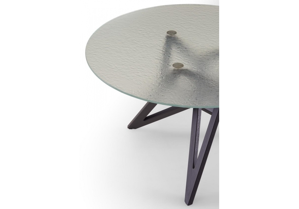 Ennea diseñada por Vincent Tordjman para Ligne Roset es una mesa redonda con patas en roble y superficie de vidrio fundido templado de 12 mm de espesor. La superficie inferior se fusiona para lograr efectos de relieve y un aspecto traslúcido por deformación.