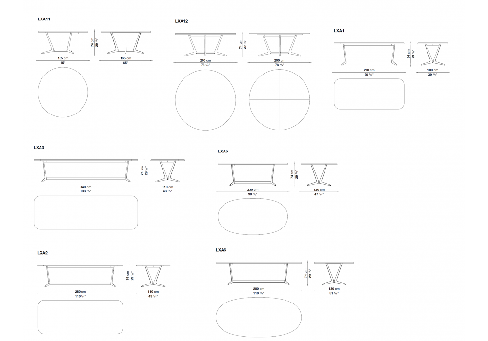 | Dimensiones | 230 x 100 x H 74 cm; 280 x 100 x H 74 cm; 340 x 110 x H 74 cm; 230 x 120 x H 74 cm; 280 x 130 x H 74 cm; Ø 165 x H 74 cm; Ø 200 cm x H 74 cm. |