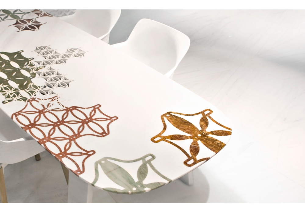 Marblelace Biscuit diseñada por Patricia Urquiola para Budri es una mesa realizada en mármol Bianco Lasa pulido e incrustado. Las incrustaciones se superponen para formar texturas de encaje, una cortina colorida que fluye suavemente a lo largo del borde de la parte superior. Los cordones calados en el mármol blanco fluyen hacia las incrustaciones de colores. Redondeados, como una galleta, los pies de mármol macizo, que combinan con la tapa.