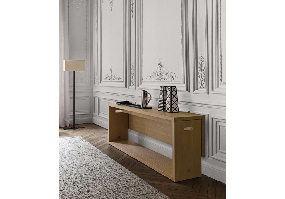 Cuma Extensible diseñada por Antonio Citterio para Maxalto es una mesa-consola de madera con tablero y estructura en wengué natural o roble claro cepillado, negro cepillado y roble gris.