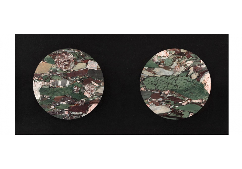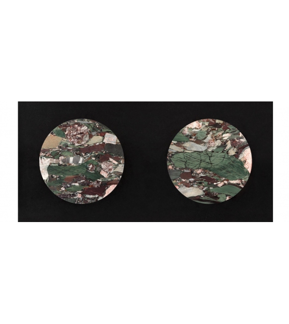 Pantheon Rectangular diseñada por Maarten De Ceulaer para Budri es una mesa realizada con fondo de mármol negro belga y círculos de mármol Opera d’Arte. Base en metal cepillado, negro mate.