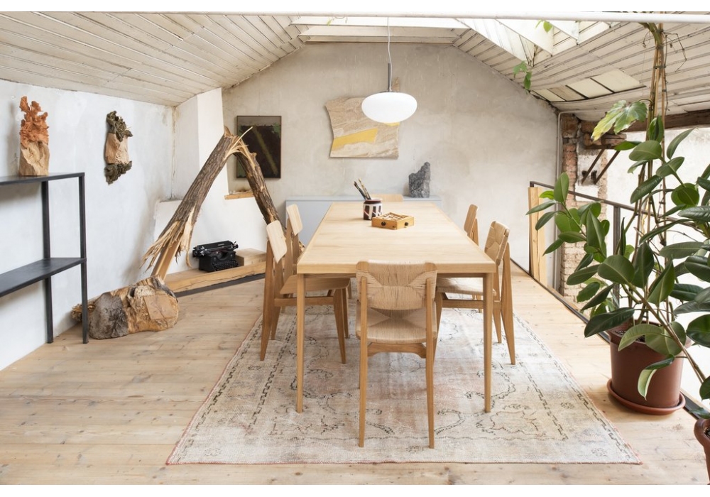S-Table diseñada por Marcel Gascoin para Gubi es una mesa de comedor extensible fabricada en nogal americano o roble.